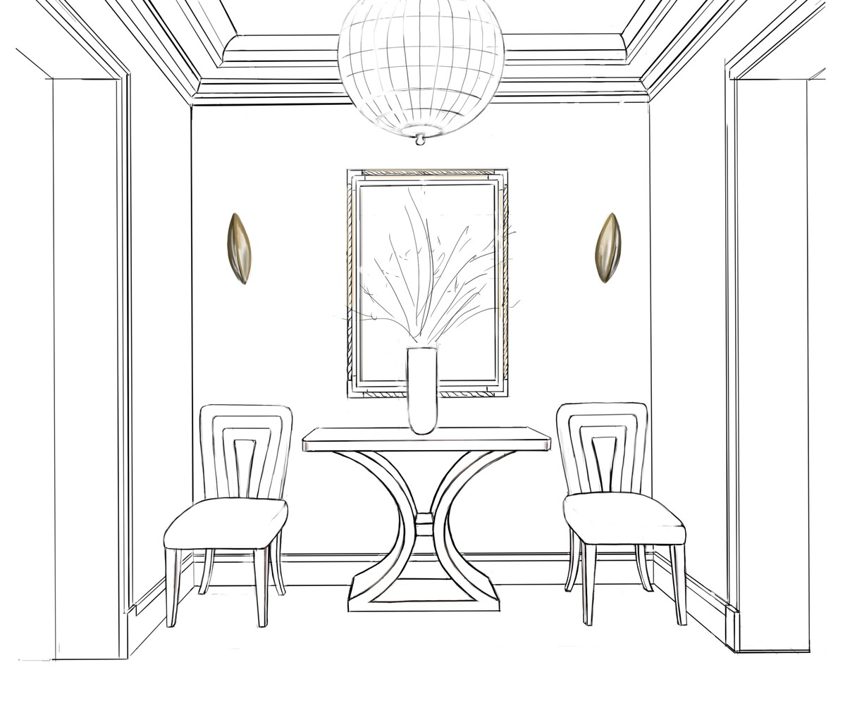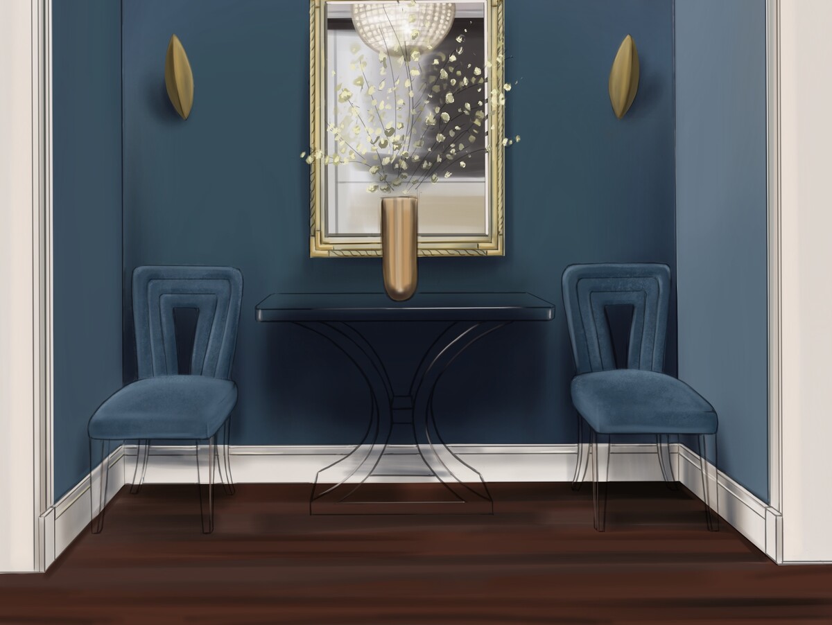 - Нарисуем стулья, консоль, светильники и предметы декора, с точностью передавая все конструктивные особенности.